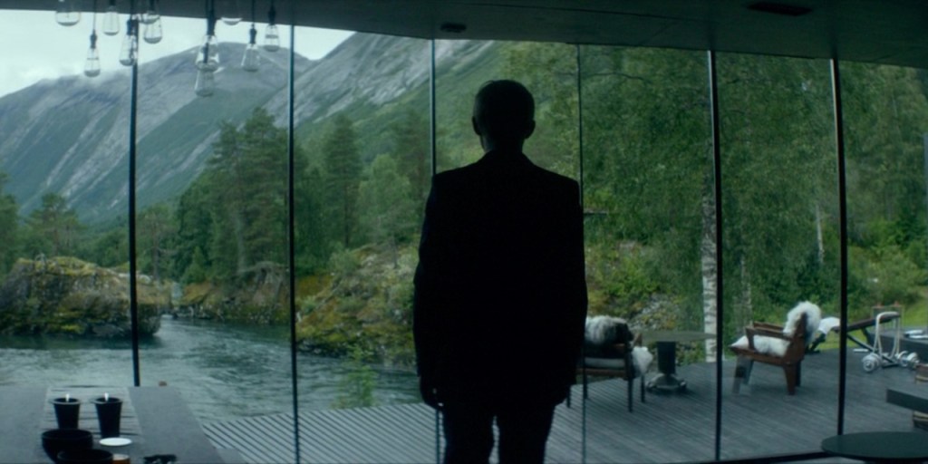 The visual style of this opening sequence reinforces the eeriness of the muted humans and electronic soundtrack. Prominent use of shallow focus to depict a workspace that is constructed out of glass doors and walls makes it difficult to discern how large the space really is and thus the viewer is spatially disoriented in each new setting. This layering of glass and mirrors, doubling some images and obscuring others, is used later in the film when Caleb meets the artificial being Ava (Alicia Vikander), who is not allowed to leave her glass-walled living quarters in the research bunker. The layering of glass and mirrors is also a critical element in the entire home/research bunker of Nathan Bates (Oscar Isaac). Outside a hand-full of scenes there is almost always a glass window or mirror in the shot. The similarity of these spaces visually reinforces the film’s late revelation that Caleb has been manipulated by Nathan, the troubled genius who created Ava.