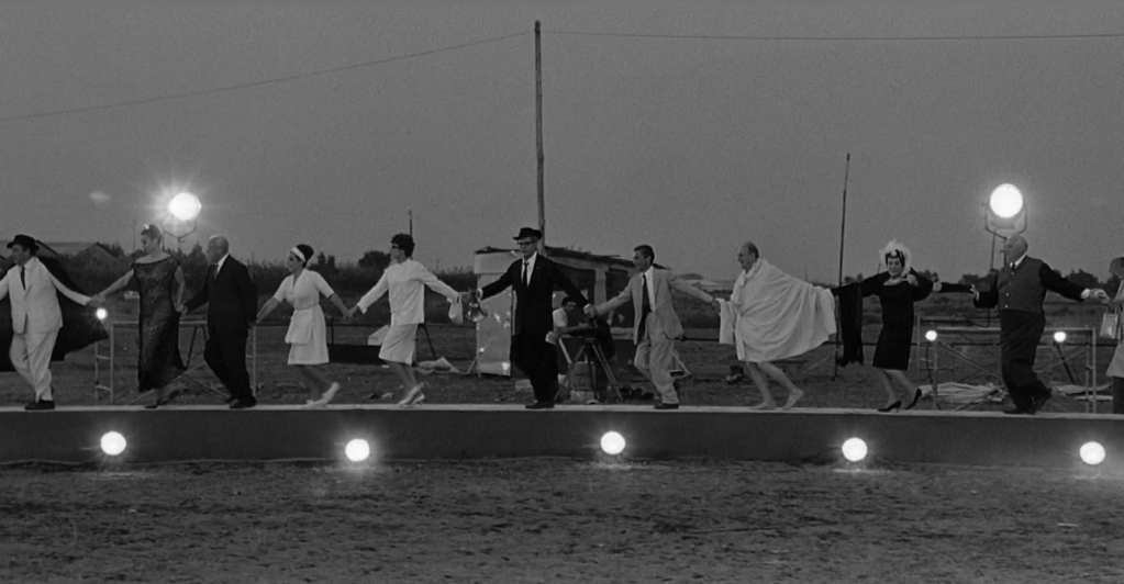 The character of Guido falls in and out of fantasy all throughout the film, for instance at the beginning of the film Guido sees a beautiful woman in the field next to the venue where he is meeting a writer and she runs elegantly toward him to hand him a glass of water, she smiles and then he realizes its just an average water woman and nothing more. Another example is the extravagant carnival fantasy ending, where all the dreams, memories and fantasies come together. Guido sees what he wants to see and Fellini achieves this by blending the two elements perfectly together. After moving from dreams to memories to fantasies, it finally reaches the screen-tests. Unlike the images before, the screen-tests can be controlled and planned and “they reflect Guido’s attempts to create not just a momentary vision but an entire fictional world: a movie” (Burke, 165). This is something Fellini himself creates in a number of his films to elaborate on his own mind and imagination. For Fellini making a film was an art and he used life to inspire his art and it was his way of creating a fictional world. 8 ½ was one of Fellini’s best films because it let the audience know what he struggles with in his own personal life as well as what he struggles in the process of making new films.