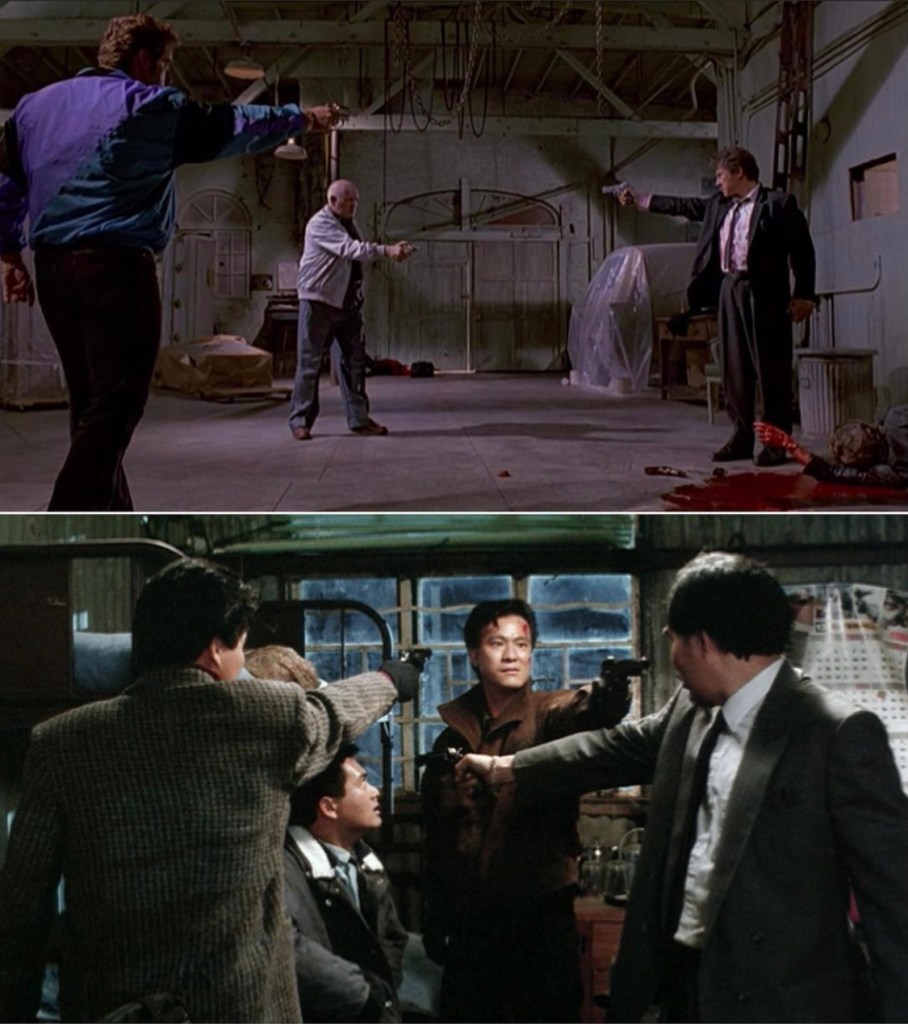 Or known as the Mexican Stand-Off is when more than two opponents aim at each other with guns. It was originated in Sergio Leone’s classic 1966 spaghetti western The Good The Bad and The Ugly, which is one of Tarantino’s favorite films. There are a couple of shots I could show to truly capture this but I feel it is pretty easy to visualize.